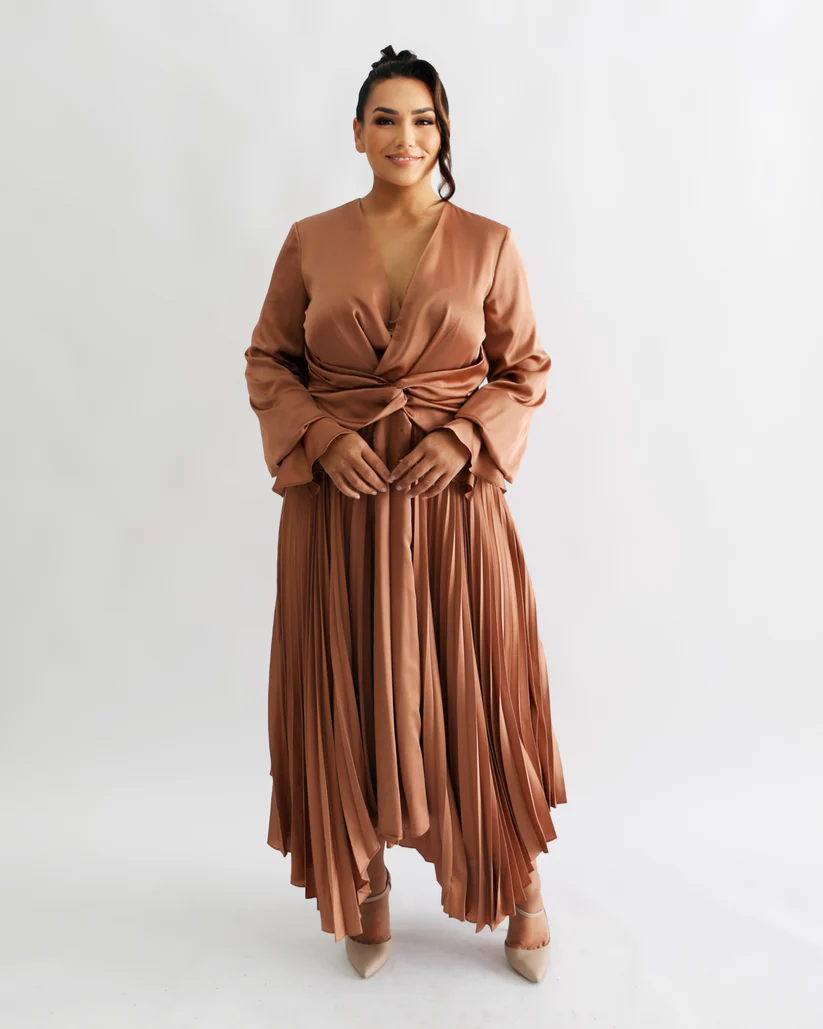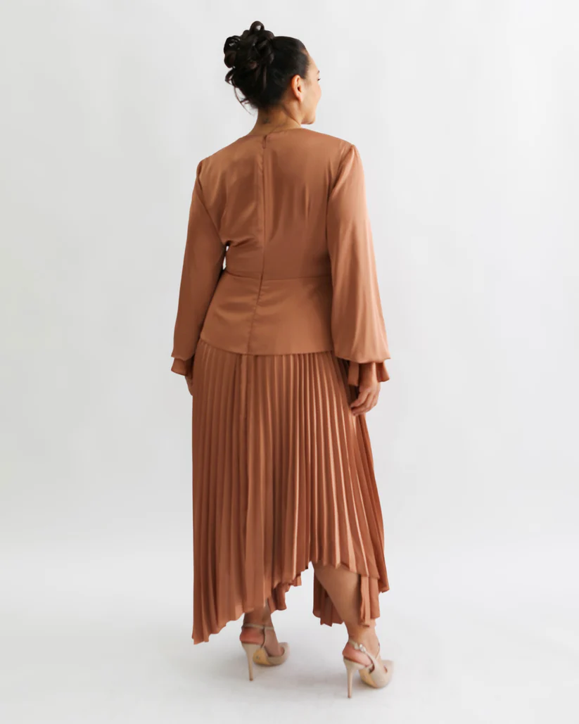Ochre Colour, billowing sleeves, accentuated cuffs, plunging neckline and front tie detail.
