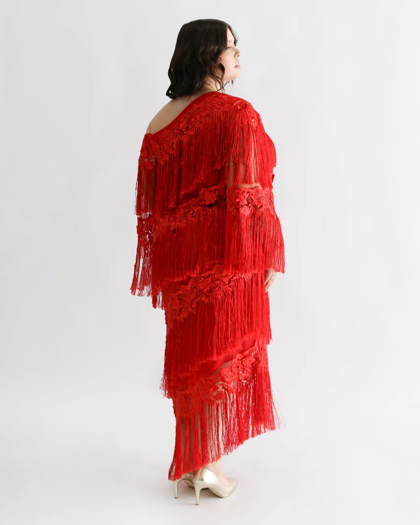 Red Long Sleeve slouch shoulder Tassel design with applique detail midaxi