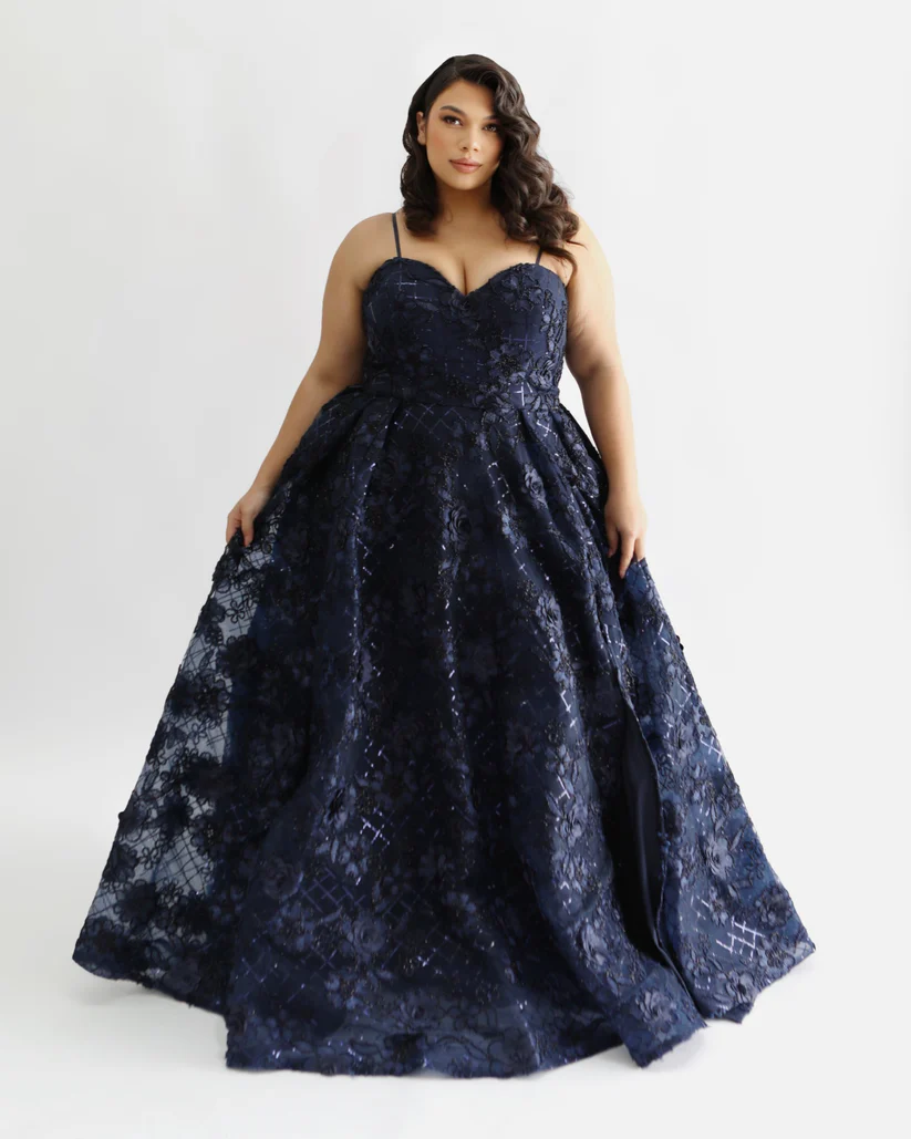 Navy gown with spaghetti straps and a sweetheart neckline. The intricate lace overlay and full skirt with corset back