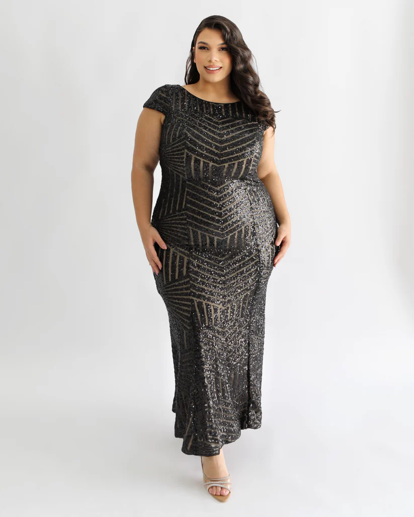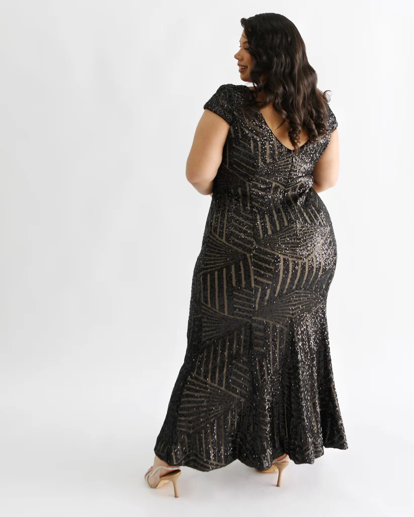 Black cap sleeve crew neckline, sheer sequin maxi dress.