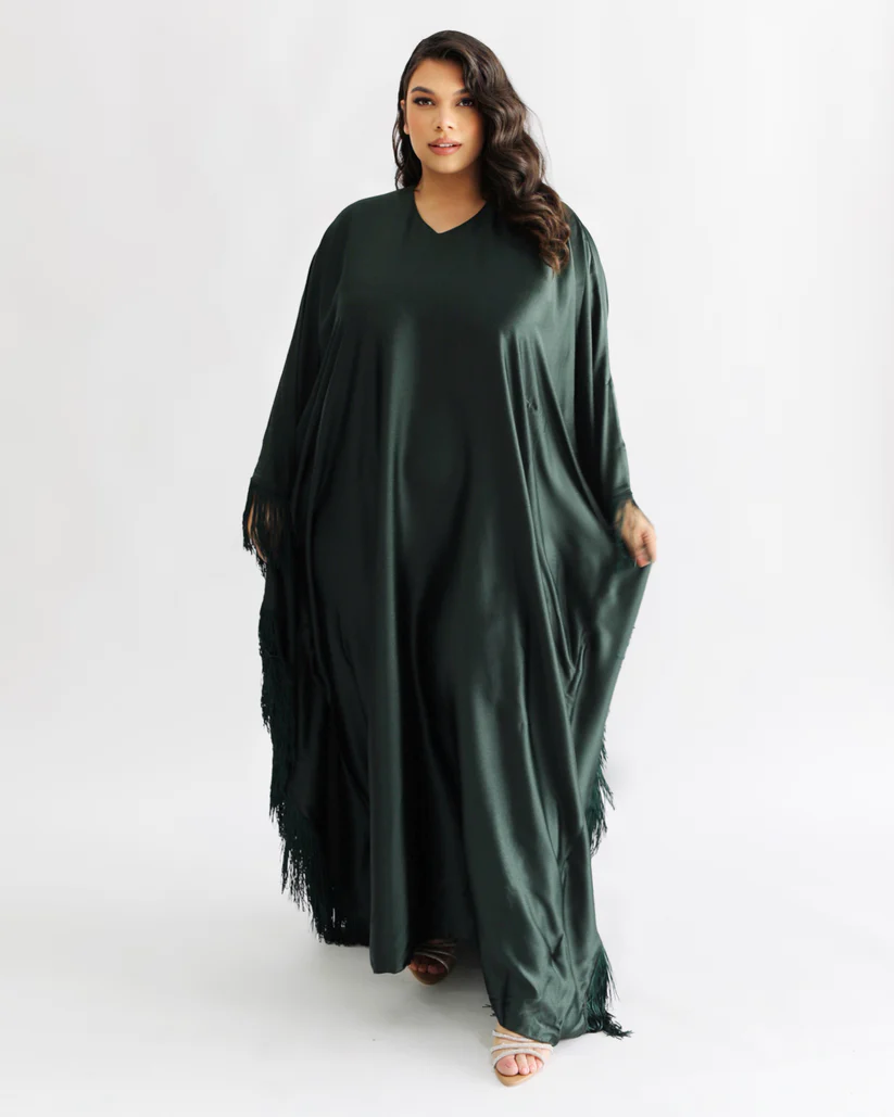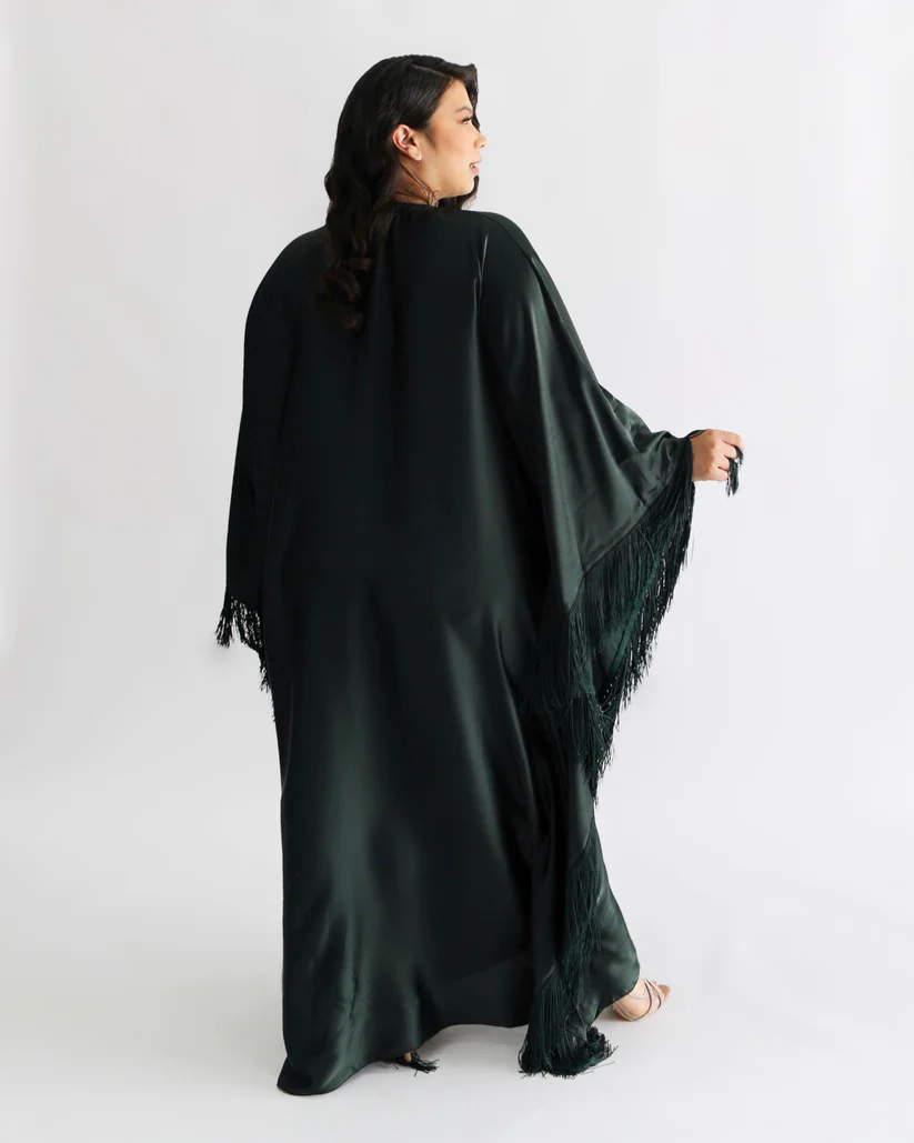 Royal Satin Emerald Butterfly kaftan with fringe trim detail.