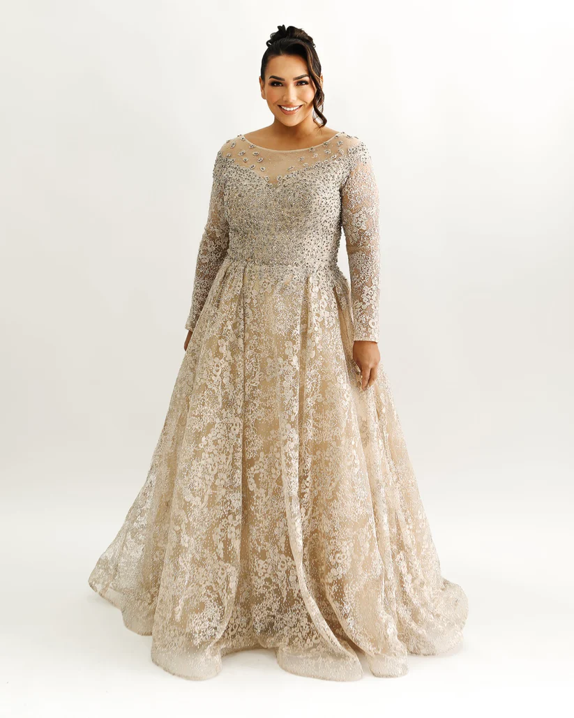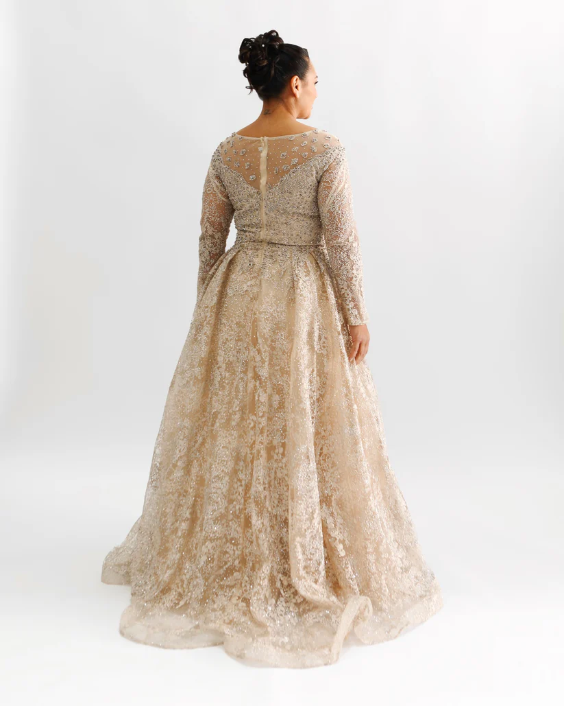 Gold long sleeve Gown, embellished with intricate lace and beadwork.