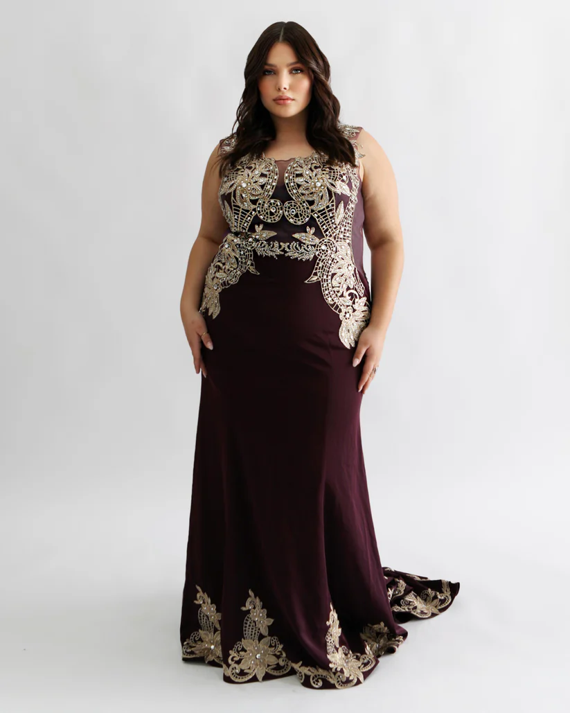 Deep Purple sleeveless gown with gold metal detail and embellishments, sheer back with trail and bottom trim detail