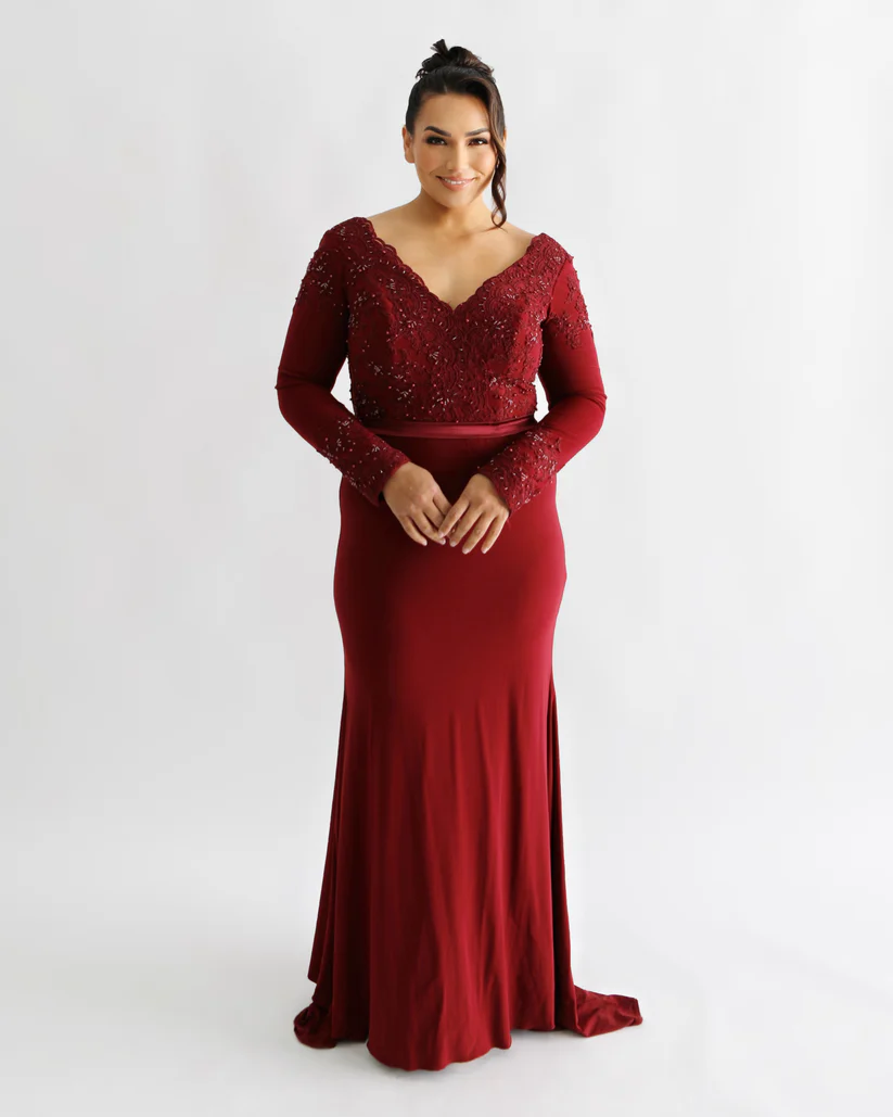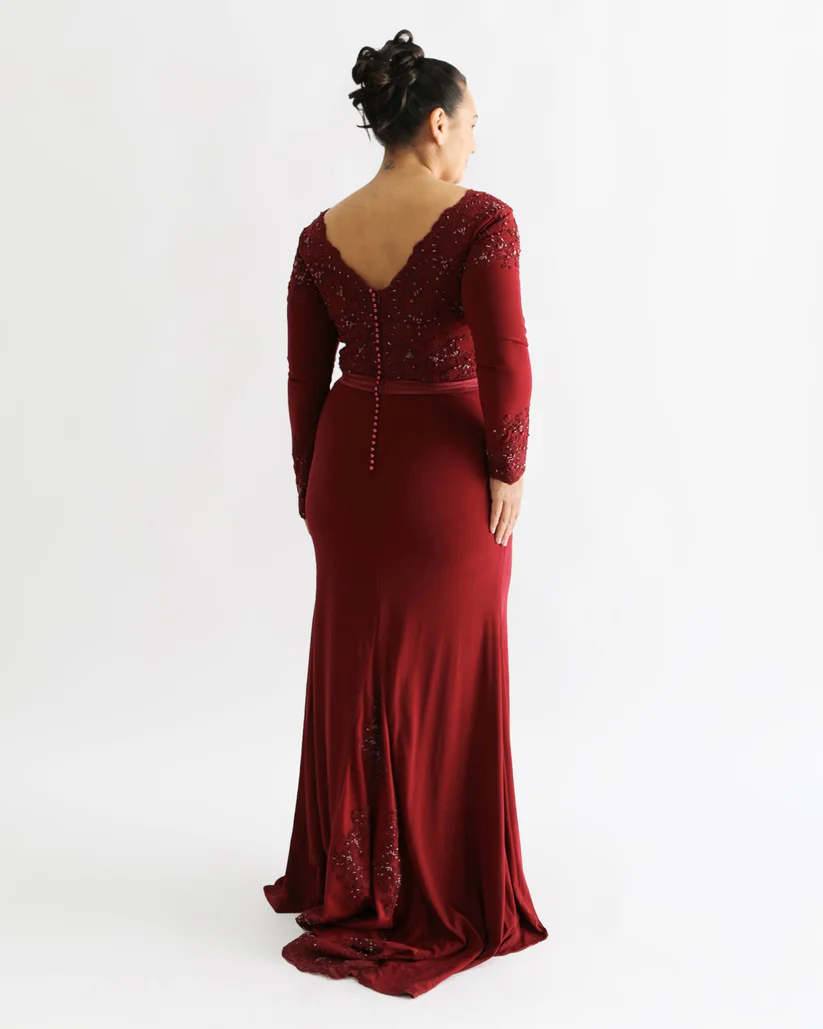 Maroon long sleeve mermaid gown, V neck with an embellished bodice and waist belt. Has a short tail with embellishments.