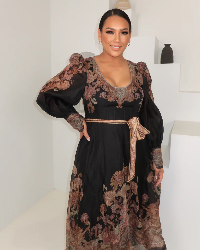 Zimmermann’s ‘Illustration’ midi is a romantic blend of vintage and drama. Featuring soft florals and paisley swirls along the neckline and hem, this beauty is crafted from a linen and silk-blend organza. The slim bodice is boned for support, while voluminous puff sleeves and a self-tie belt bring it all together.